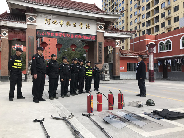 2024年11月21日下午,河池市卫生学校开展了一次反恐防暴应急演练活动。学校副校长刘钢、学生科科长苏云淑、副科长张乐平和全体安保人员共20余人参加活动。